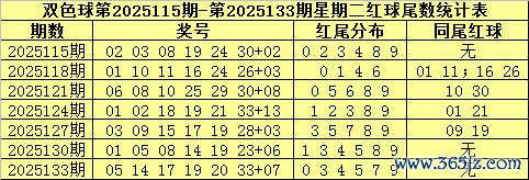 双色球第2025135期开出奖号为:01 02 05 09 25 32+10,红球余数分散为1 2 5 9,包含同尾红球:02 32;05 25。